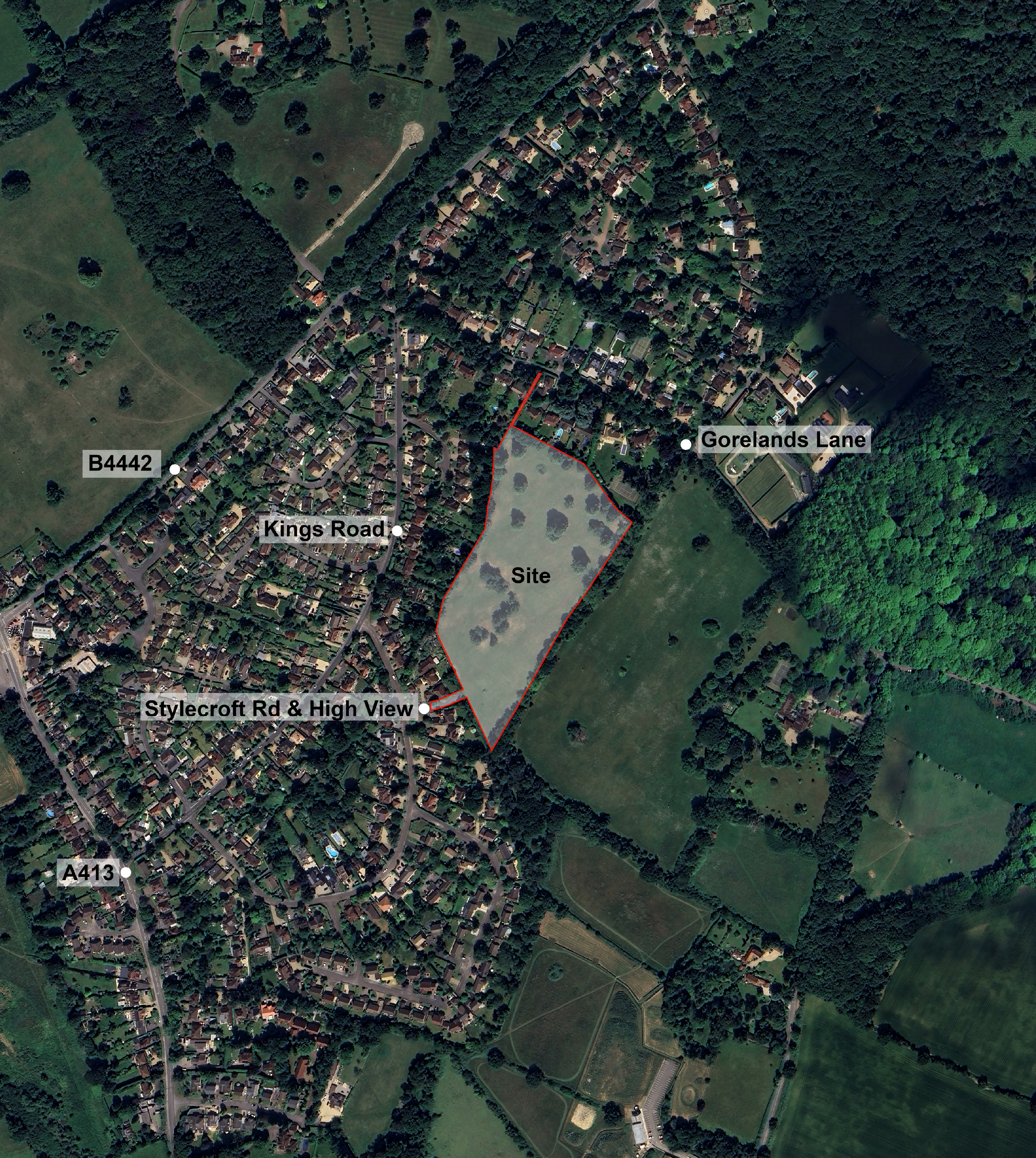 The site is located to the east of Chalfont St Giles, set behind existing homes on High View. It is a modest and contained area of land made up of grassland and established vegetation, with agricultural fields lying further to the east. The land is not publicly accessible, and there are no public rights of way within the site itself. The site does not include any designated heritage or ecological assets, and the nearest listed buildings are Ashwells Barn and Ashwells Farmhouse on Chesham Lane to the south east.