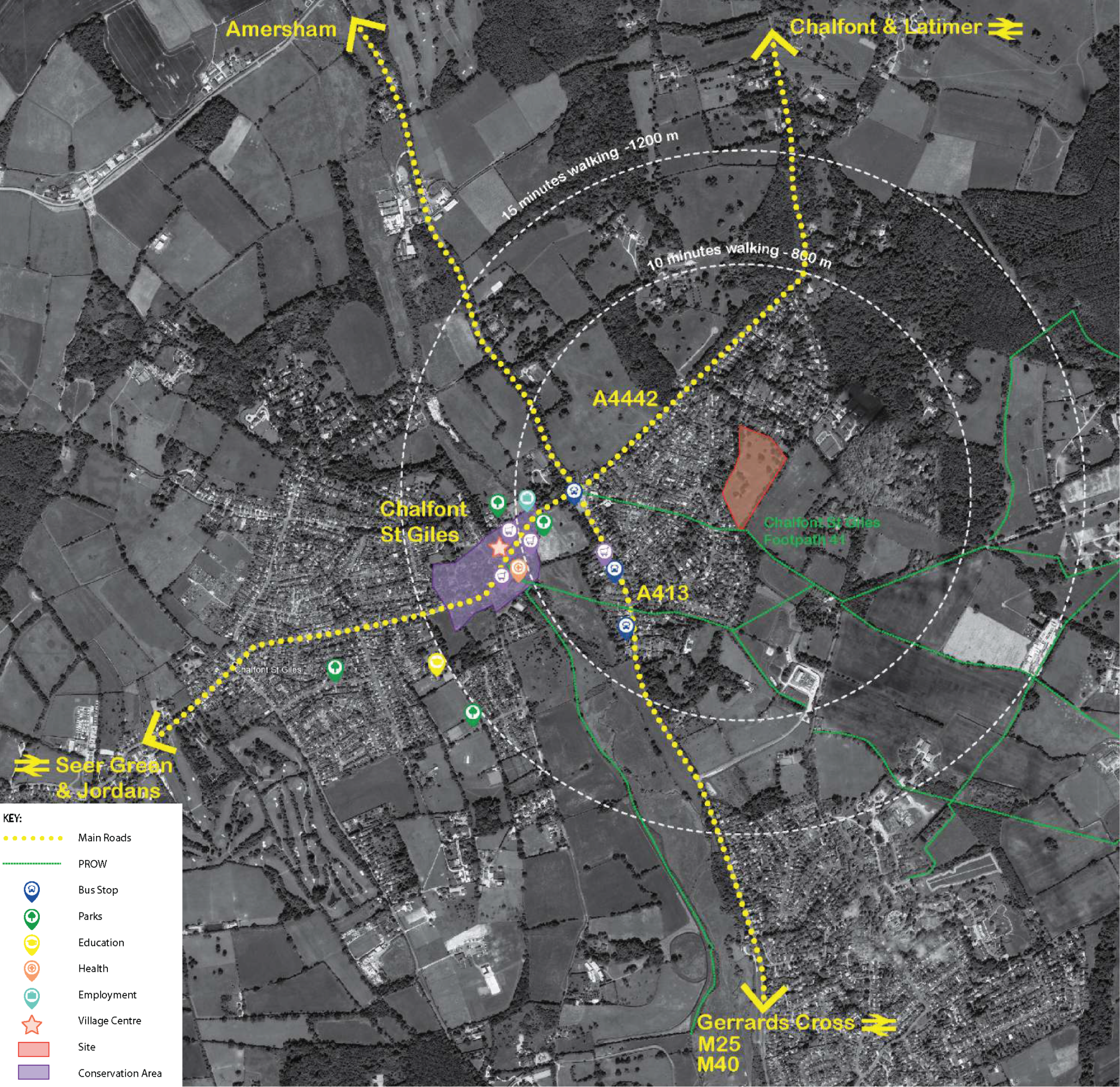 The site sits within the Green Belt, but early assessment indicates that it makes only a weak contribution to Green Belt purposes and aligns with the new national Grey Belt policy. This policy allows residential development where there is an unmet need for housing, the land falls within the Grey Belt category, the location is sustainable, and the proposals deliver benefits such as affordable homes, new green space and infrastructure improvements. Chalfont St Giles is defined as a tier three settlement with a good range of services, and the site is considered to be in a sustainable location.