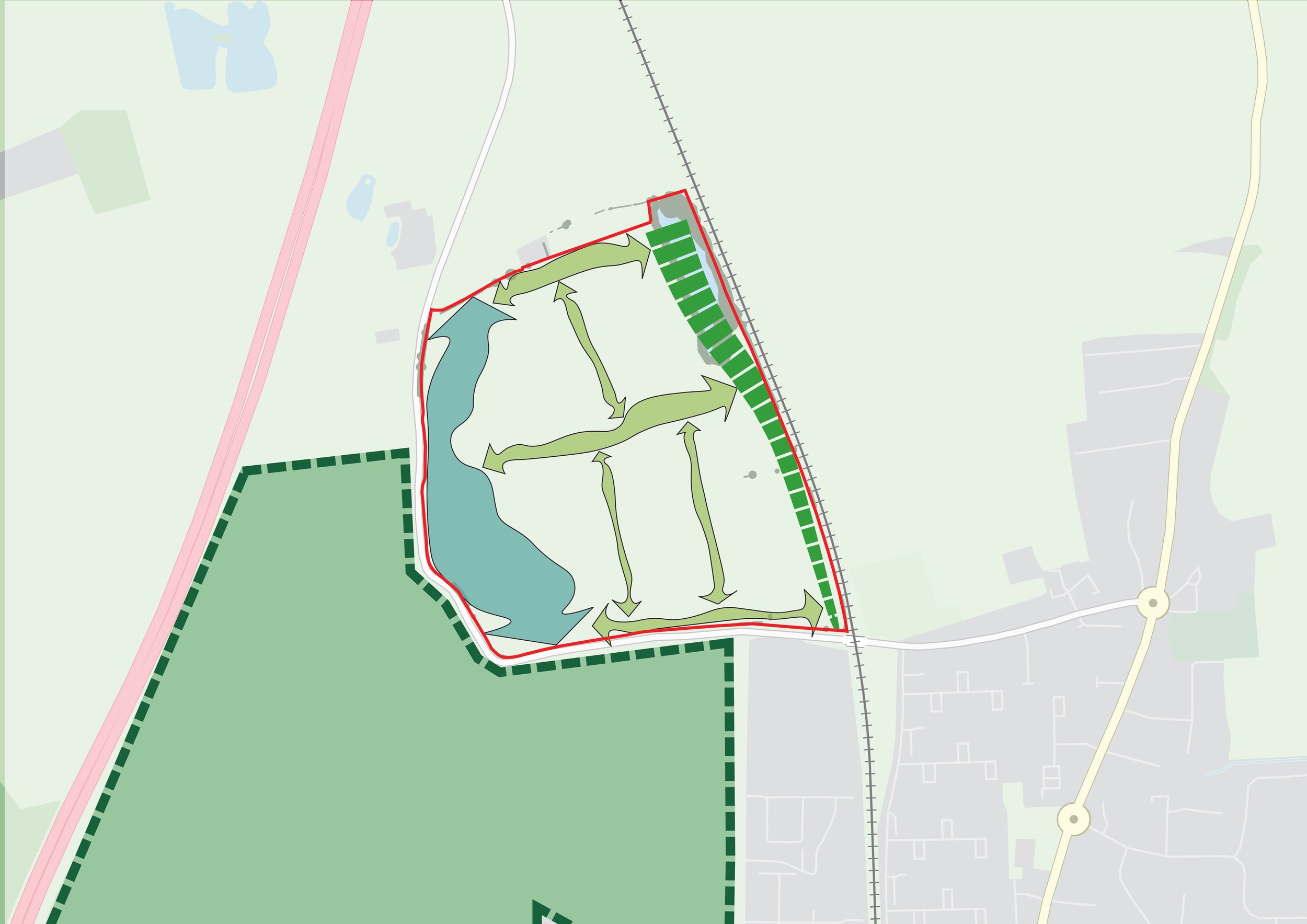 The site’s central pond will be enhanced as a biodiversity and landscape asset, contributing to both drainage and habitat objectives. A series of Sustainable Drainage Systems (SuDS), such as swales, rain gardens and attenuation basins, will manage surface water on-site while also forming part of the landscape design.